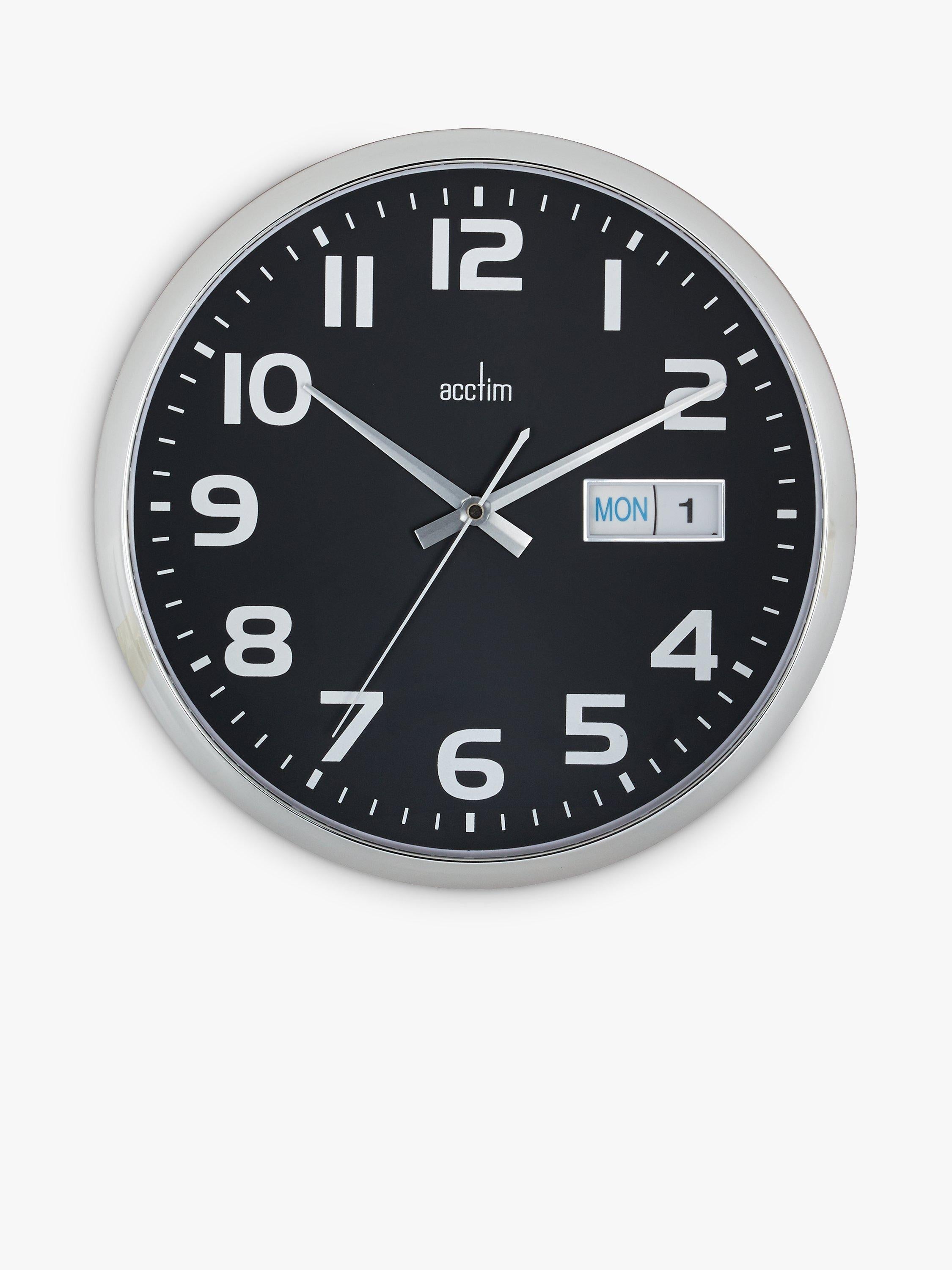 This Acctim 32cm Analogue Wall Clock is designed for superior timekeeping reliability. It features a clear day and date window, essential for daily planning and reference. The clock boasts a stylish chromed case and protective domed glass lens. Its internal quartz movement ensures exceptionally accurate time display year after year. This functional home accessory provides clear, dependable information at a glance.