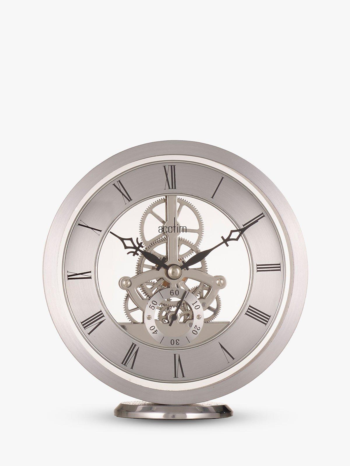 Acctim Millenden Skeleton Mantel Clock is a 13Cm silver design for elegant display. This carriage clock meticulously reveals its internal mechanisms through clear glass. It employs traditional Roman numerals marking the dial area. Quartz movement guarantees reliable and accurate timekeeping. Perfect for any sophisticated interior space.