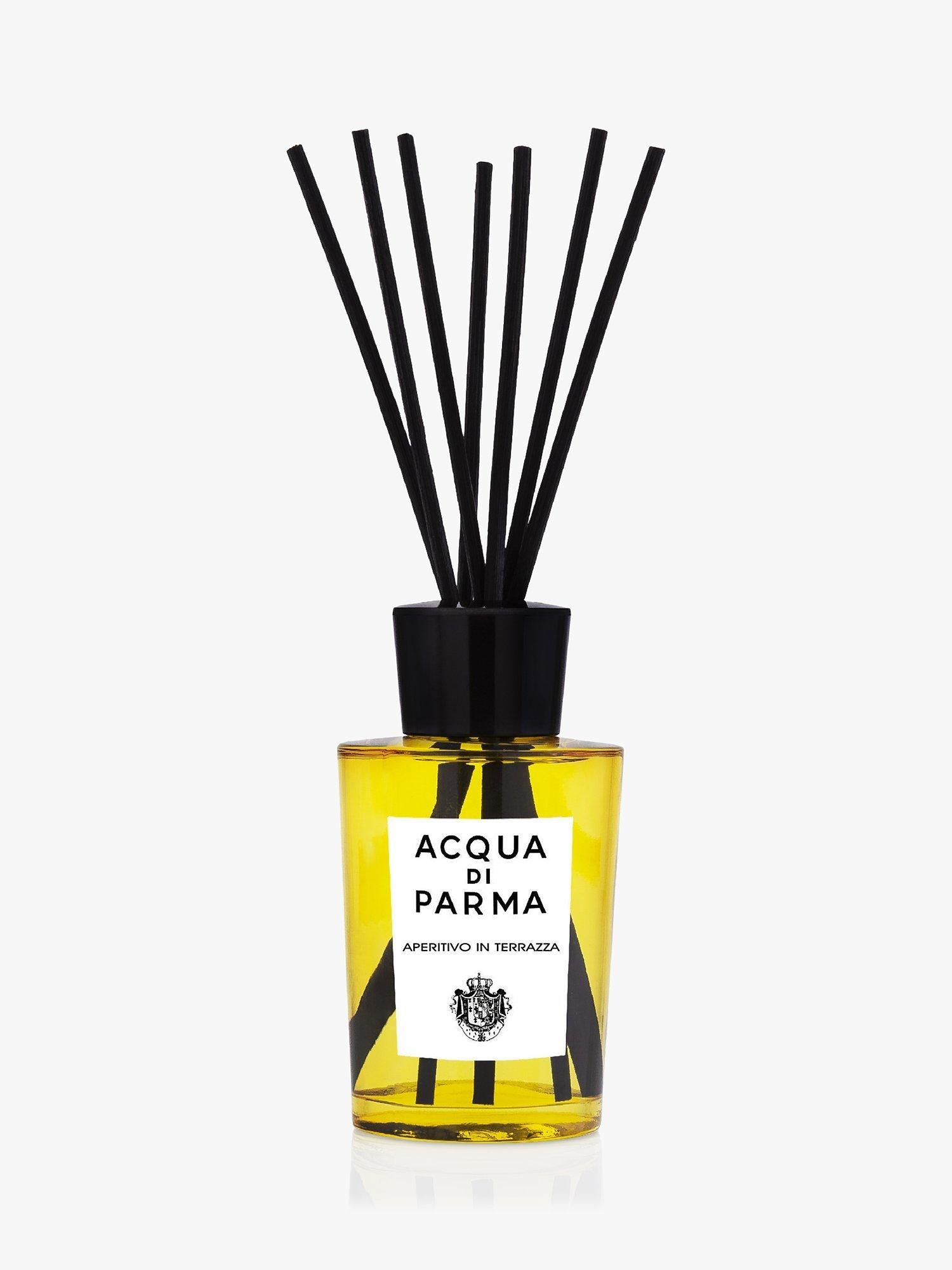 Acqua Di Parma Aperitivo In Terrazza Diffuser 180Ml perfectly captures the essence of the classic Italian aperitivo ritual. This fine home fragrance blends sunny elegance with sparkling citruses, evoking warm summer breezes overlooking beautiful city vistas. It offers a refined, long-lasting ambient scent experience for your elegant living areas indeed.