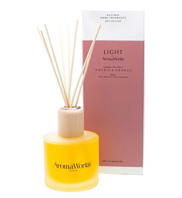 This AromaWorks London reed diffuser offers a continuous, natural scent experience for any room in your home. It features the specific fragrance named 'Light', blending zesty citrus with warm woody undertones for a pleasant atmosphere. The use of 100% pure essential oils ensures a clean and authentic aromatic diffusion throughout your space.