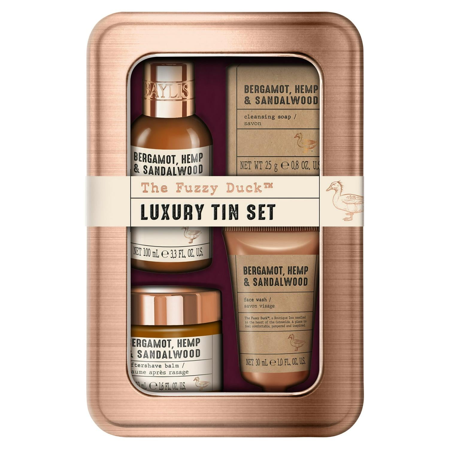 This Baylis & Harding collection features sustainable luxury grooming essentials presented in a practical, reusable storage tin. It offers a complete regimen with an energising Bergamot, Hemp, and Sandalwood fragrance profile.