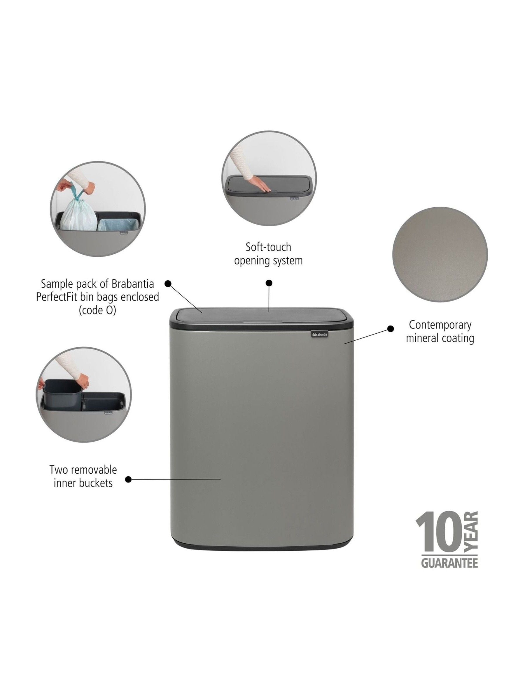 Looking for a beautiful solution for waste separation? This XXL Brabantia Bo Touch Bin 2 x 30 litre is just that, and all you need for easy waste separation at home. With two spacious and removable inner buckets for 2 kinds of waste, it opens at the lightest touch and fits perfectly against a wall too. A big beauty and a big help! Easy clean, easy recycling - two removable plastic inner buckets. Opens with the lightest touch. Perfect match - sample pack of Brabantia PerfectFit bin bags enclosed (code O). Textured feel - contemporary mineral coating. Cradle-to-Cradle® Certified, Bronze level. Problem-free use - 10 year guarantee and service.