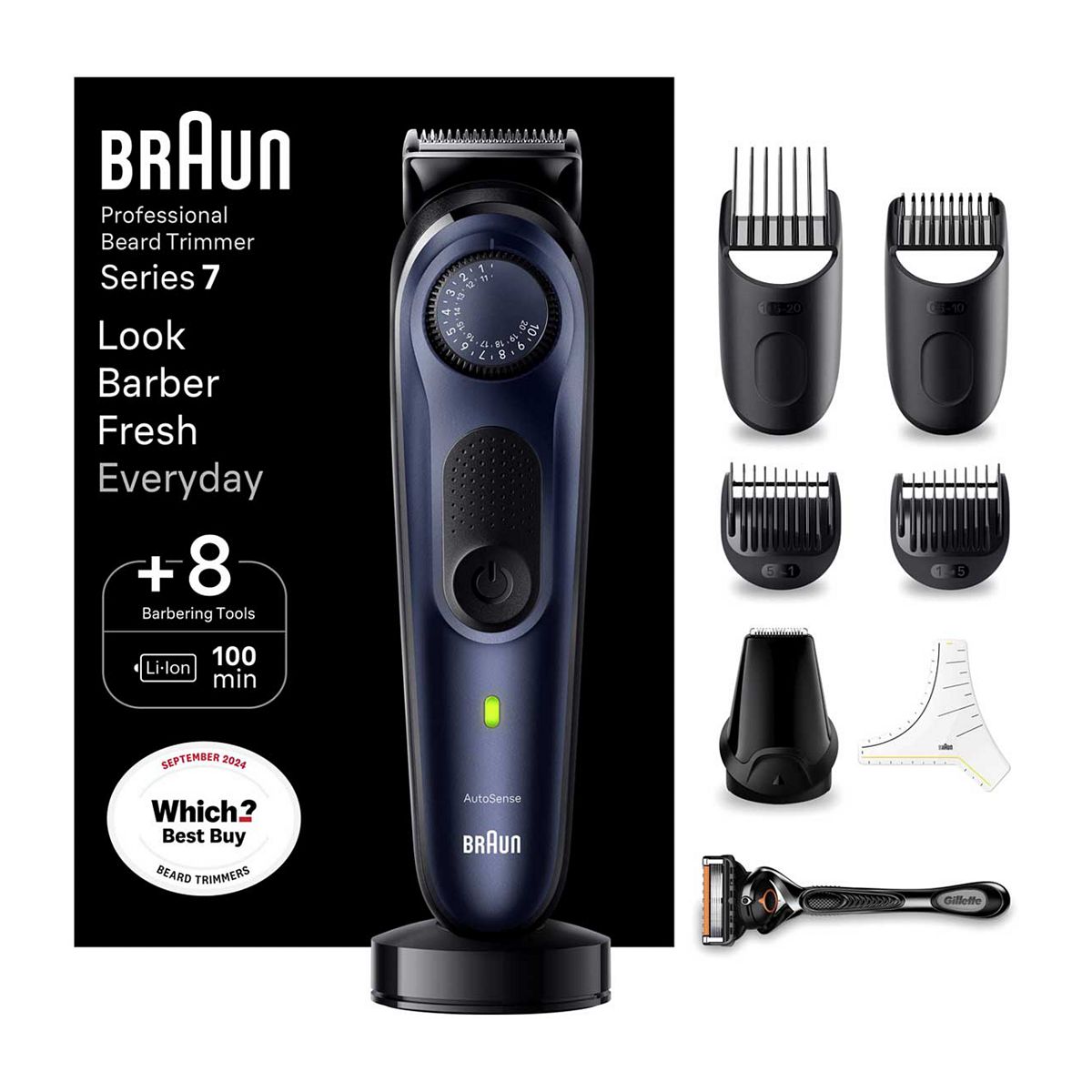 Erzielen Sie frische Ergebnisse wie beim Barbier zu Hause mit dem professionellen Series 7 Barttrimmer von Braun. Präzise in jedem Schnitt mit unserem schärfsten ProBlade. Autosense sorgt für Gleichmäßigkeit bei allen Bärten. ProWheel mit 40 Längeneinstellungen. 100 Minuten kabellose Laufzeit.