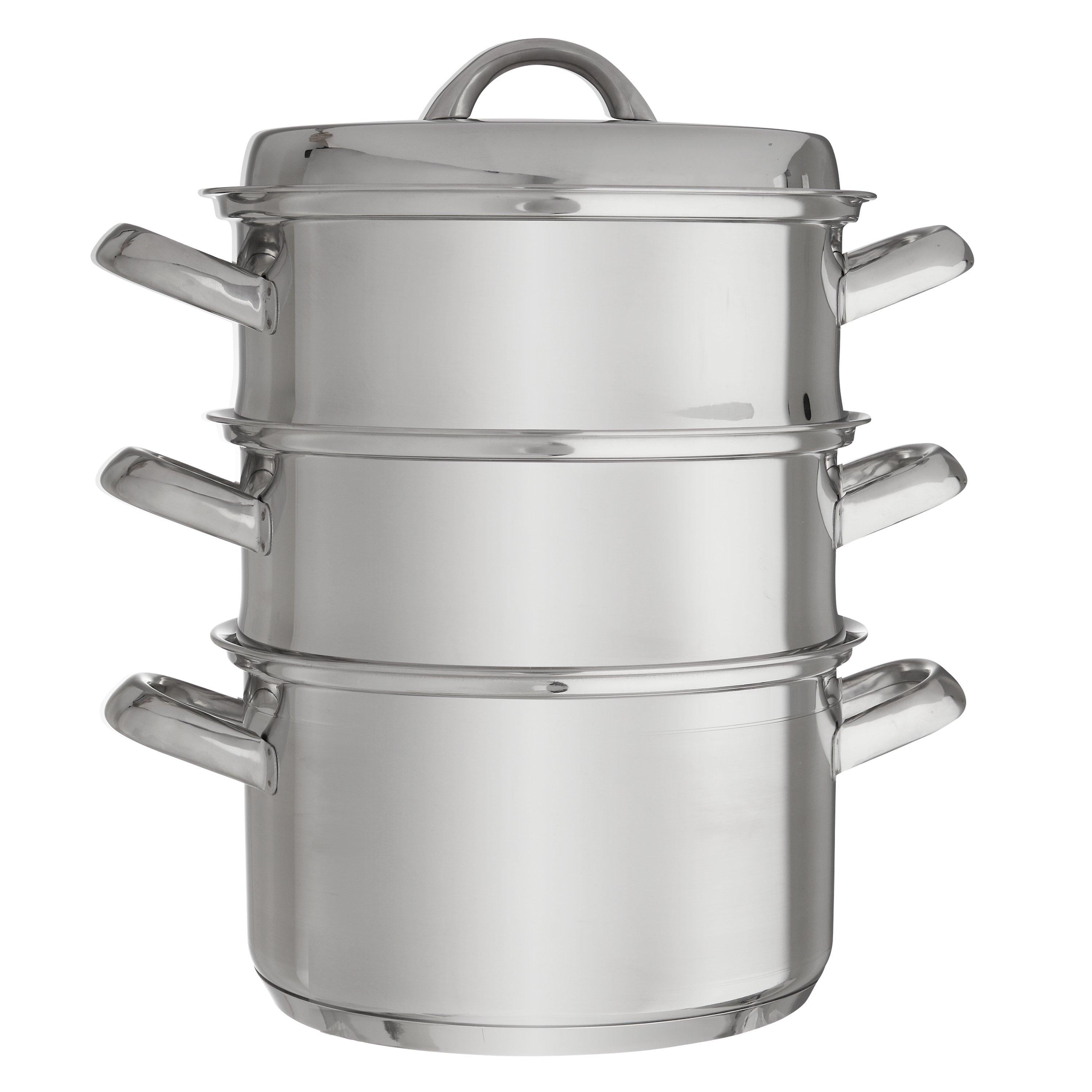 John Lewis presents the Classic Stainless Steel 20Cm Steamer Set. This reliable three-piece cookware offers excellent heat conduction qualities. Constructed from durable 18/10 stainless steel, it resists corrosion effectively. The base is magnetic, making this set fully induction-compatible for modern kitchens. It includes a pot, two separate steamers, and a matching lid for versatility.