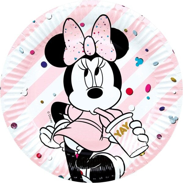 This pack of eight Disney Gem Minnie Mouse party plates is ideal for themed celebrations and entertaining. Made from durable paper, these 9-inch plates feature a charming Minnie Mouse design with striped and gem printed accents.