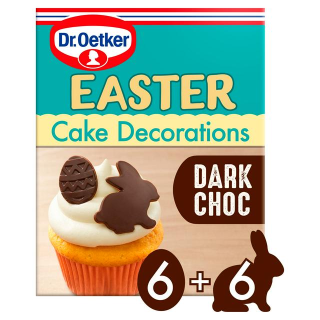 These Dr Oetker pieces bring the joy of Easter baking to your kitchen creations. This 26g pack contains charming bunny and egg shapes made from rich dark chocolate. These edible toppers are suitable for vegetarians and ideal for decorating cakes or desserts during the festive season.