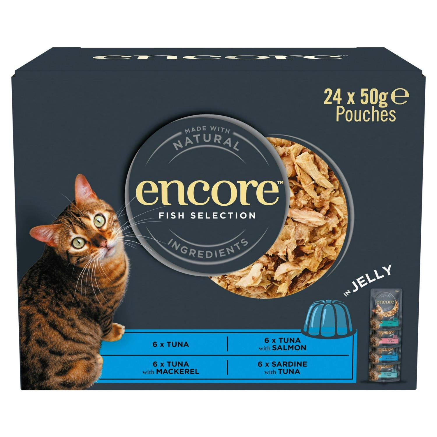 This Encore Fish Selection provides varied, appealing meals for adult cats within convenient 50g jelly pouches. It is specifically formulated as a complementary pet food meant to accompany a standard dry diet.