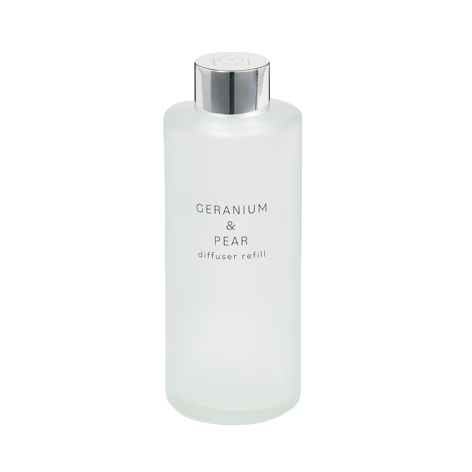 Read MoreEnjoy this refreshing scent for longer with this diffuser refill. Simply pour into a reed diffuser and let the floral fragrance of geranium mingle with the fresh and fruity scent of pear. Comes in a frosted glass bottle with a silver lid.