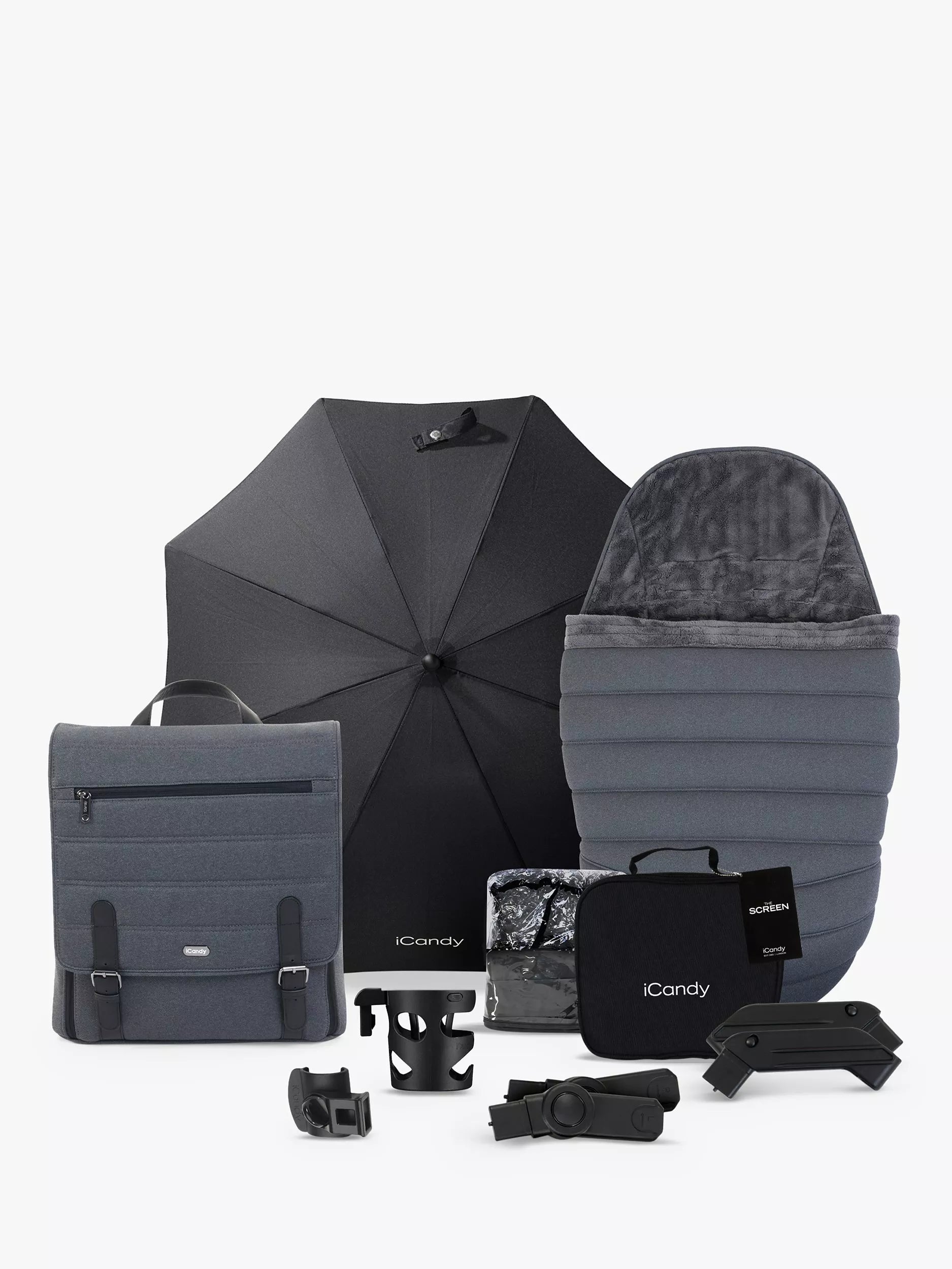 It comes with a changing bag with backpack straps, a changing mattress, a bottle cooler and straps to attach to your iCandy Pushchair. It also includes the luxurious Duopod which can be used as a plush liner to cocoon your child or as a complete footmuff for colder weather to keep your child cosy and warm. You'll also get a practical cupholder, a parasol for sunny days as well as a clamp to secure either of these to your pushchair. Finally, to protect your baby/toddler from UV in very hot weather there is the iCandy shade which is UV 50+.