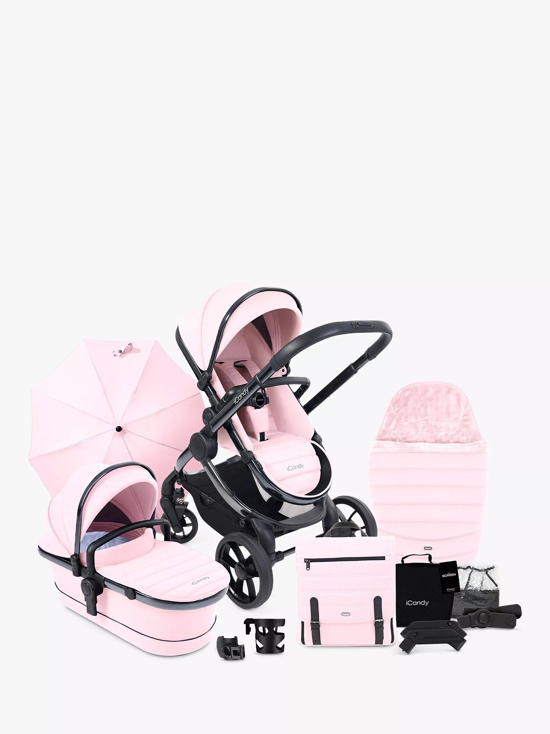This handy bundle is the full package of stroller and accessories. It includes the Peach 7 stroller, carrycot, car seat adaptors, rain cover and elevators. Additionally, you'll also get some brilliant accessories including an iCandy changing bag, Duo-Pod, parasol, cup holder, clamp, and sunshade.