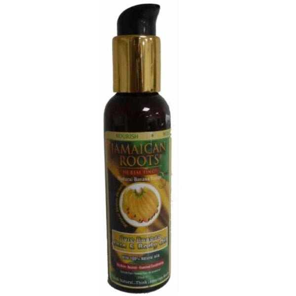 jamaican roots pure banana skin and body oil have been specially formulated for skin and body it moisturizes skin and reduces dryness of the skin it also helps to tone and restore elasity of the skin