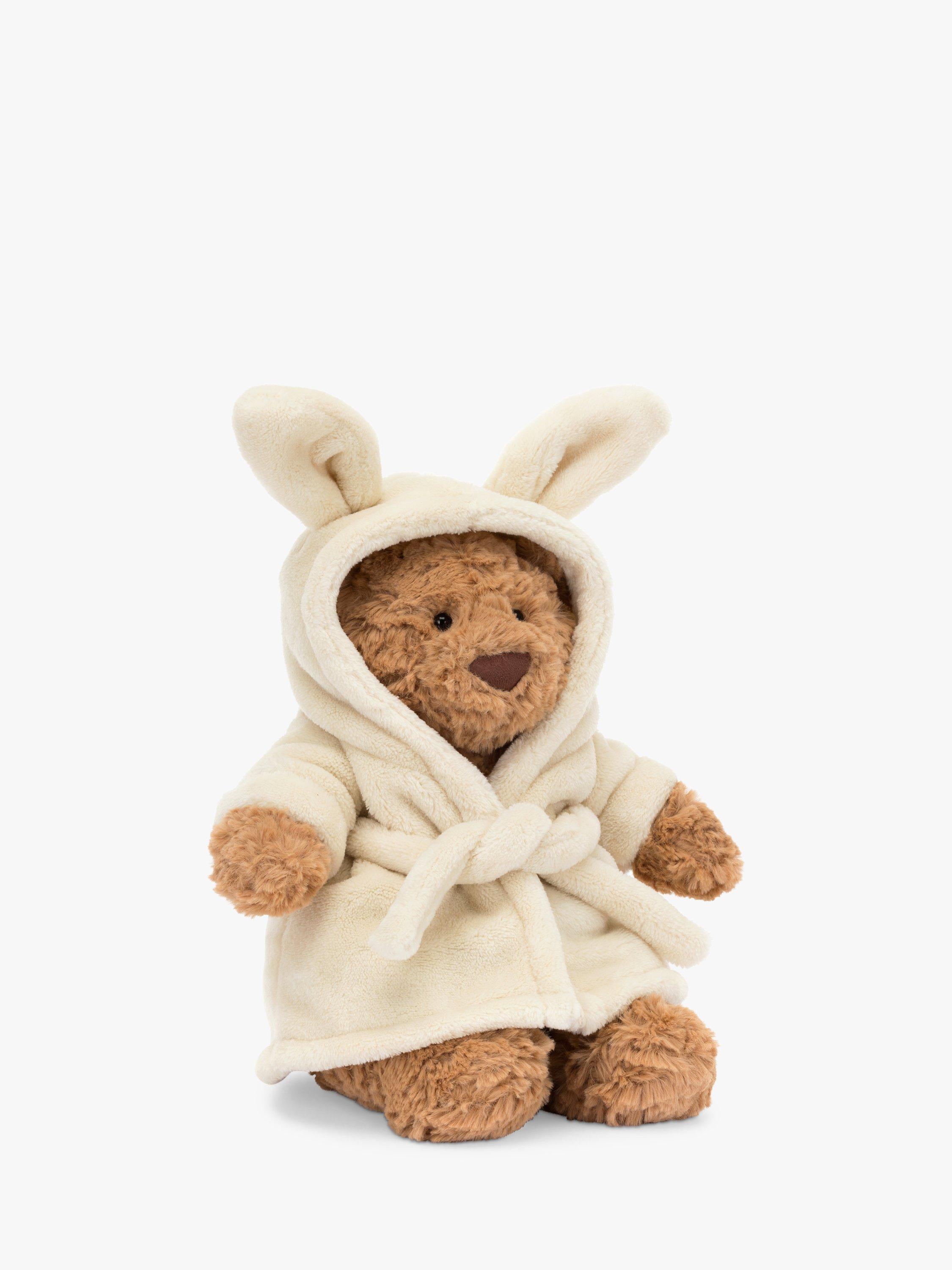 Experience the soft texture of the Jellycat Bartholomew Bear, a truly gentle companion dressed for comfort. He wears a unique oatmeal towelling bathrobe finished with adorable floppy bunny ears. This premium soft toy is rigorously tested and safe for children from birth.
