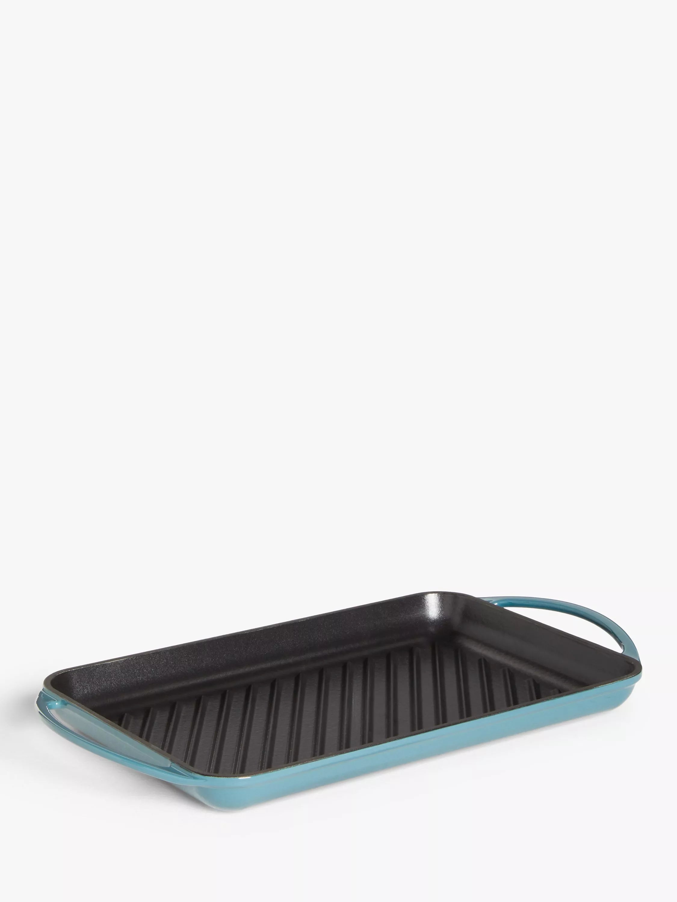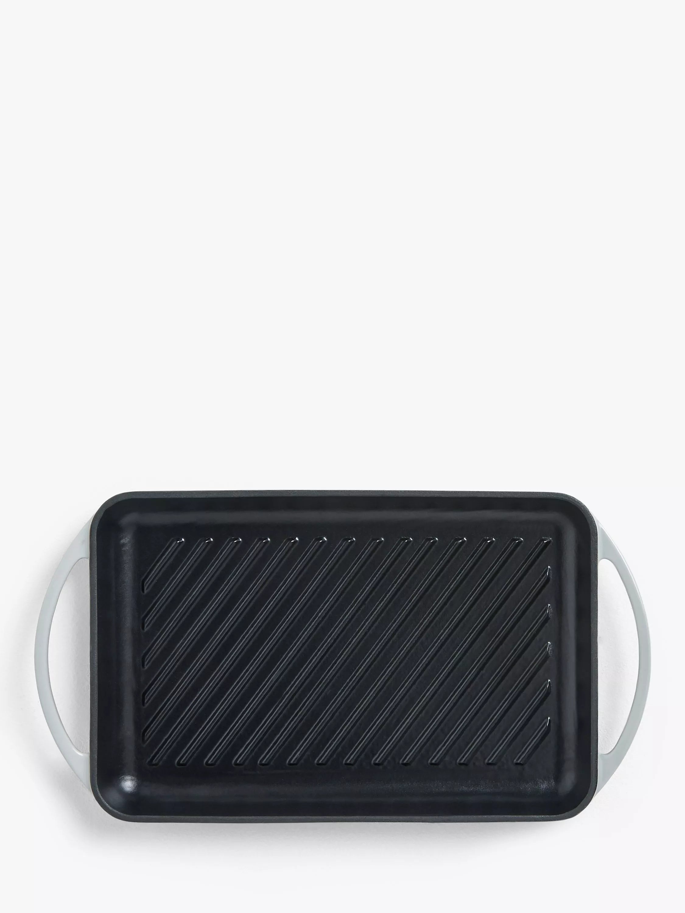 This rectangular grill pan has a smooth, porcelain enamel exterior that's durable, keeps its colour and is easy to clean. Grooves sear meat, fish and vegetables for barbecue-style grilling and they drain off liquids and fat for healthier cooking.