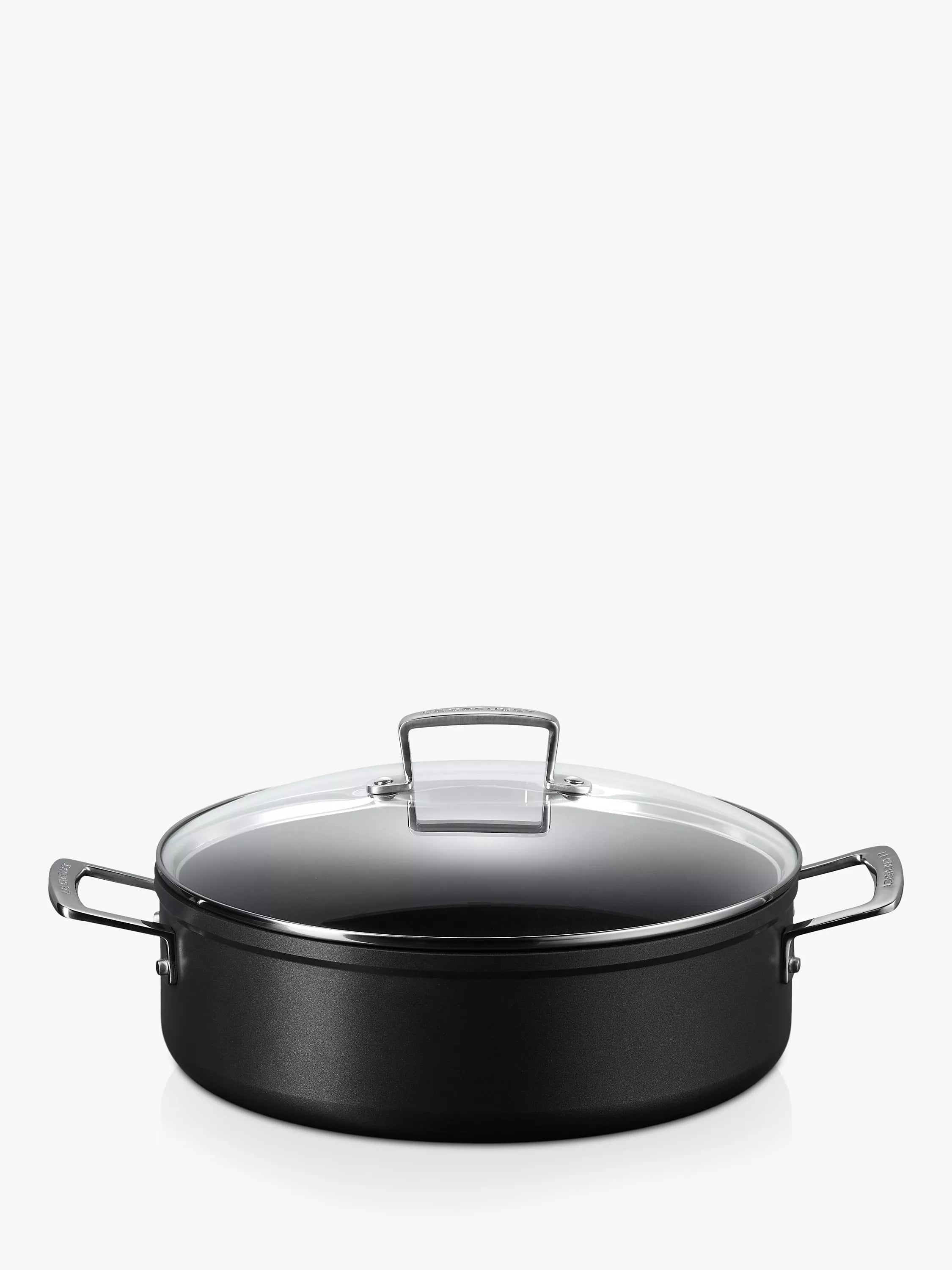 A sauteuse and glass lid from Le Creuset's Toughened Non-Stick cookware range. This pan has deep sides for easy stirring, reducing splashes and spills, and it comes with a glass lid to retain moisture when slow cooking and making casseroles and stews. Use it on the hob or in the oven, and without the lid as an oven roaster or baker. The contemporary, stylish design means it can go from the oven to the table for serving.