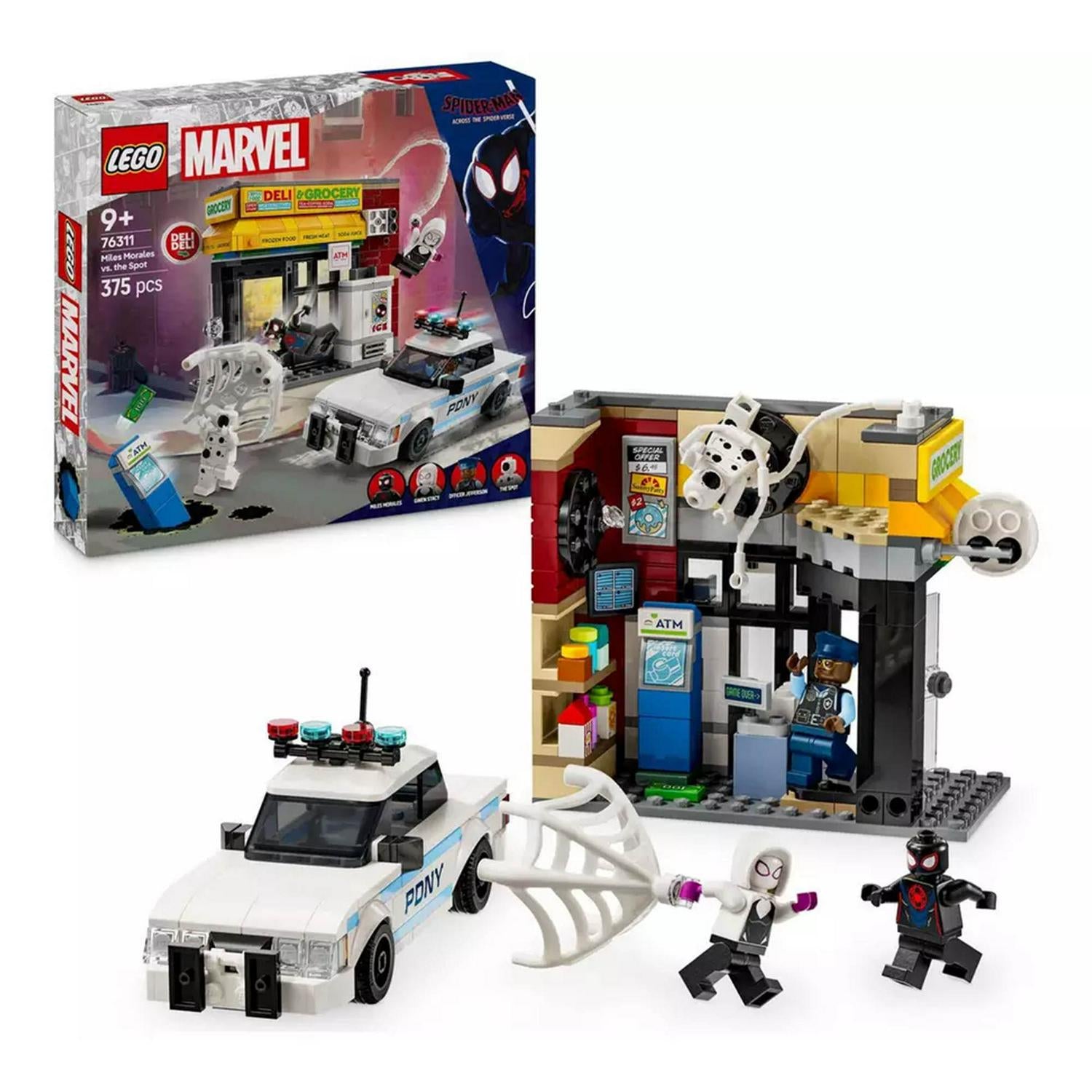 • LEGO Spider-Man minifigures – The set comes with Miles Morales, The Spot, Gwen Stacy and Officer Jefferson minifigures, plus web-slinging accessories.