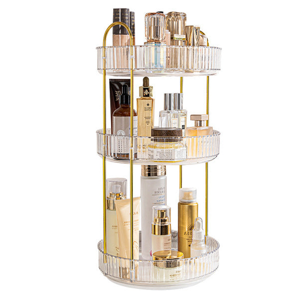 This Livingandhome 3-tier rotating organizer merges modern style with practical, luxurious details for your vanity area. Crafted from durable plastic, it features arc gold handles and amber side guards, adding an elegant accent. Its thoughtful design ensures all your daily essentials are kept tidy and easily accessible at all times.