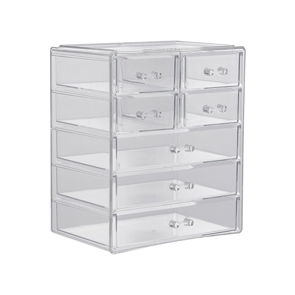 Large storage space with 3 large drawers and 4 smaller drawers The drawers are easy to pull out with a smooth surface Compact size makes it suitable for placement on dressers or countertops Specifications Size: 24.13cm W x 15.87cm D x 29.21cm H Product Type: Makeup Organizer Primary Material: Plastic Mount Type: Freestanding Drawers Included: Yes Number of Drawers: 7 Finish: Transparent Package Included 1 x Makeup Organizer Package Specifications Package Dimensions (WxDxH): 28 x 20.5 x 33.5cm Gross Weight: 2.25kg