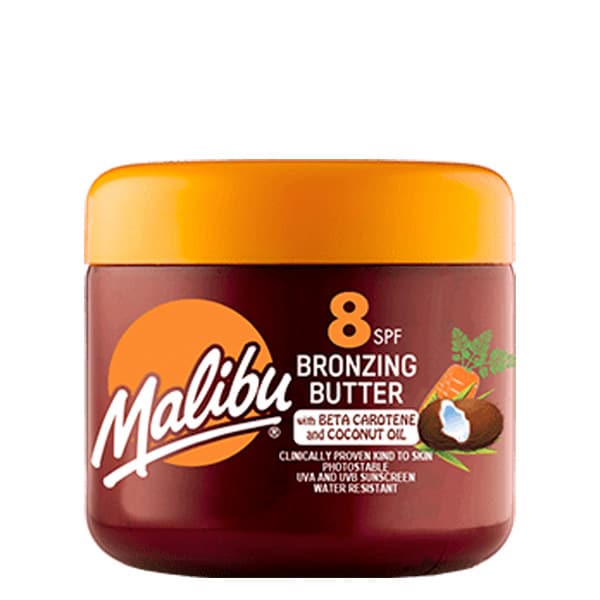 Read Morebronze and protect rapidly build a bronzed glowing tan with malibus beta carotene body butter moisturise the skin and protect against harmful and damaging uv rays with a low sp factor 2