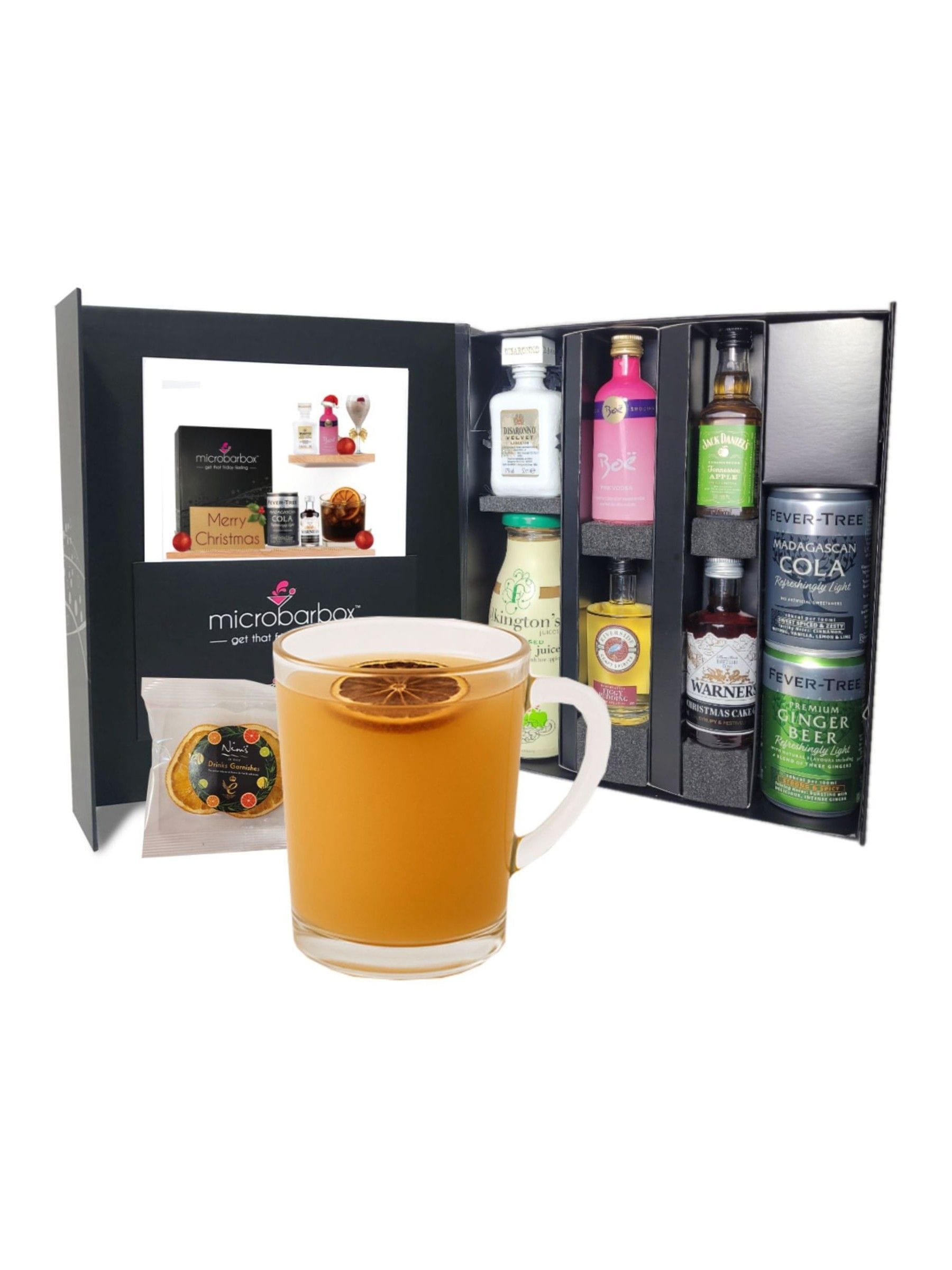 Give the gift of festive cheer with this gorgeous Micro Bar Box Christmas Cocktails Gift Set, full of festive cheer, presented in a luxury magnet-close box. Indulge in the cosy flavours of a Gingerbread Martini or toast to the holidays with the sweet and velvety Christmas Kiss. If you're feeling bold, the Dark Christmas Night offers a rich, flavourful twist, while the Christmas Pudding Mule brings a spicy, fruity kick to your Christmas festivities. It’s the perfect set to add a little sparkle to your holiday season! Contains 4 cocktails in this box: Gingerbread Martini, Christmas Kiss, Dark Christmas Night and Christmas Pudding Mule BOX CONTENTS: Gingerbread Vodka Liqueur (20% Vol) 50ml Christmas Pudding Vodka Liqueur (20% Vol) 50ml Baileys Irish Cream Liqueur (17% Vol) 50ml Riverside Figgy Pudding Rum Liqueur (20% Vol) 50ml Chambord Black Raspberry Liqueur (17% Vol) 50ml Disaronno Velvet Amaretto Cream Liqueur (17% Vol) 50ml Folkington s Ginger Beer 250ml Glasses not included. The Christmas Cocktail Gift Set contains 5.5 units of alcohol.