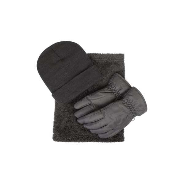 Read More100% Polyester. Fabric: Fleece, Knitted, Soft Touch. Cuff: Adjustable Wrist Strap. Contents: 1 Beanie, 1 Neck Gaiter, Gloves. Reversible. Water Resistant.