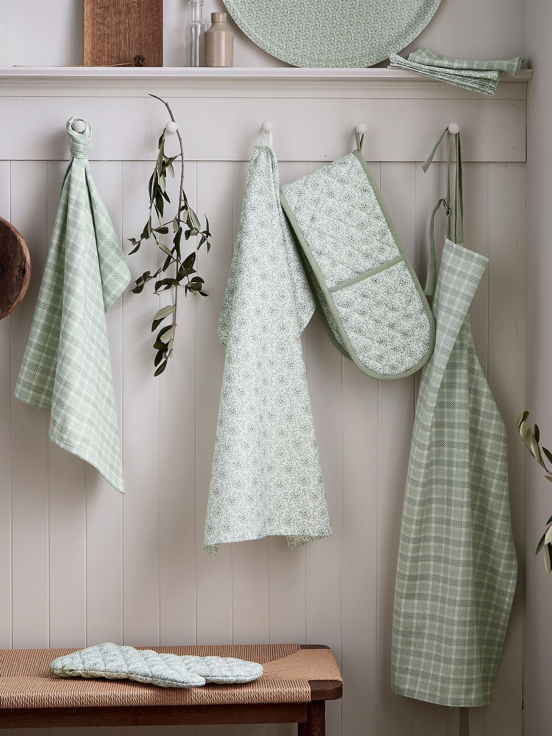 All-over vine patterned single oven mitt in sage green with piped edging and hanging loop. 100% Cotton.