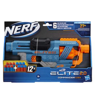 The NERF Elite 2.0 Commander RD-6 is a handheld dart blaster featuring a rotating drum mechanism for consistent firing. This reliable toy is designed for engaging in fast-paced backyard action or structured indoor play sessions. It offers straightforward priming and is suitable for users aged 8 and above.