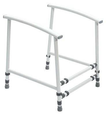 The NRS Healthcare Nuvo Childrens Toilet Frame offers essential stability and support around the lavatory. This device is constructed from a sturdy white metal frame designed to fit securely around standard toilets. It assists younger users who require added security when sitting down or standing up from the toilet. The frame's open design ensures complete access to the seat area is maintained.