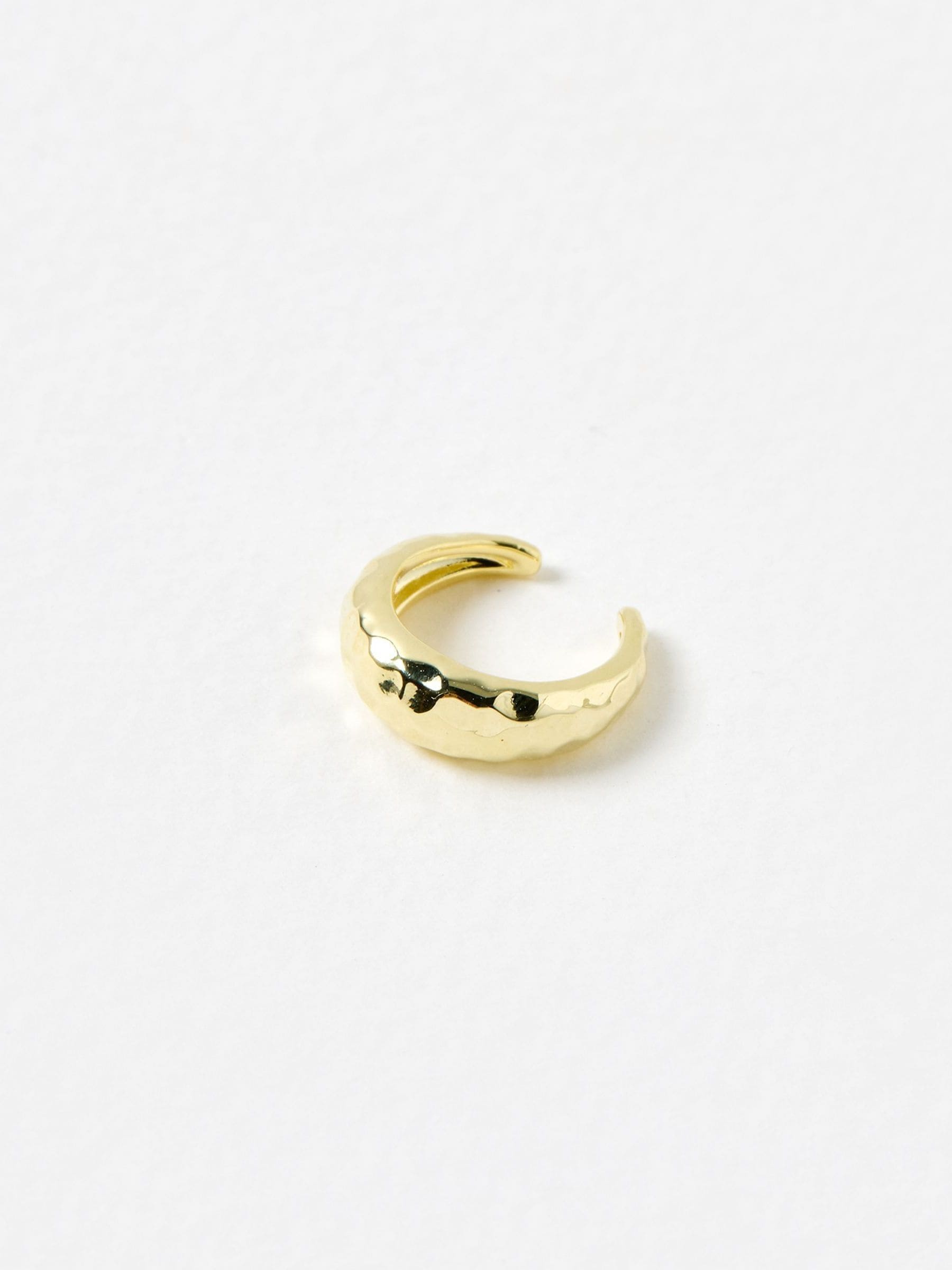 Gold plated ear cuff with a lightly hammered surface and polished, shiny finish.