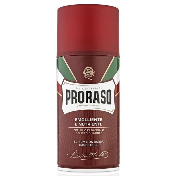 Our Proraso (Red) nourish shaving foam with Shea Butter & Sandalwood is rich in emollients that soften the hair, facilitate a deep shave and give a regenerating and nourishing effect. With all the pleasure of an easy and quick shave even on the hardest beards and the driest skin. The formula, enriched with sandalwood oil and shea butter, softens the beard and ensures deep nourishment for the skin. It comes in a bottle of 300 ml.