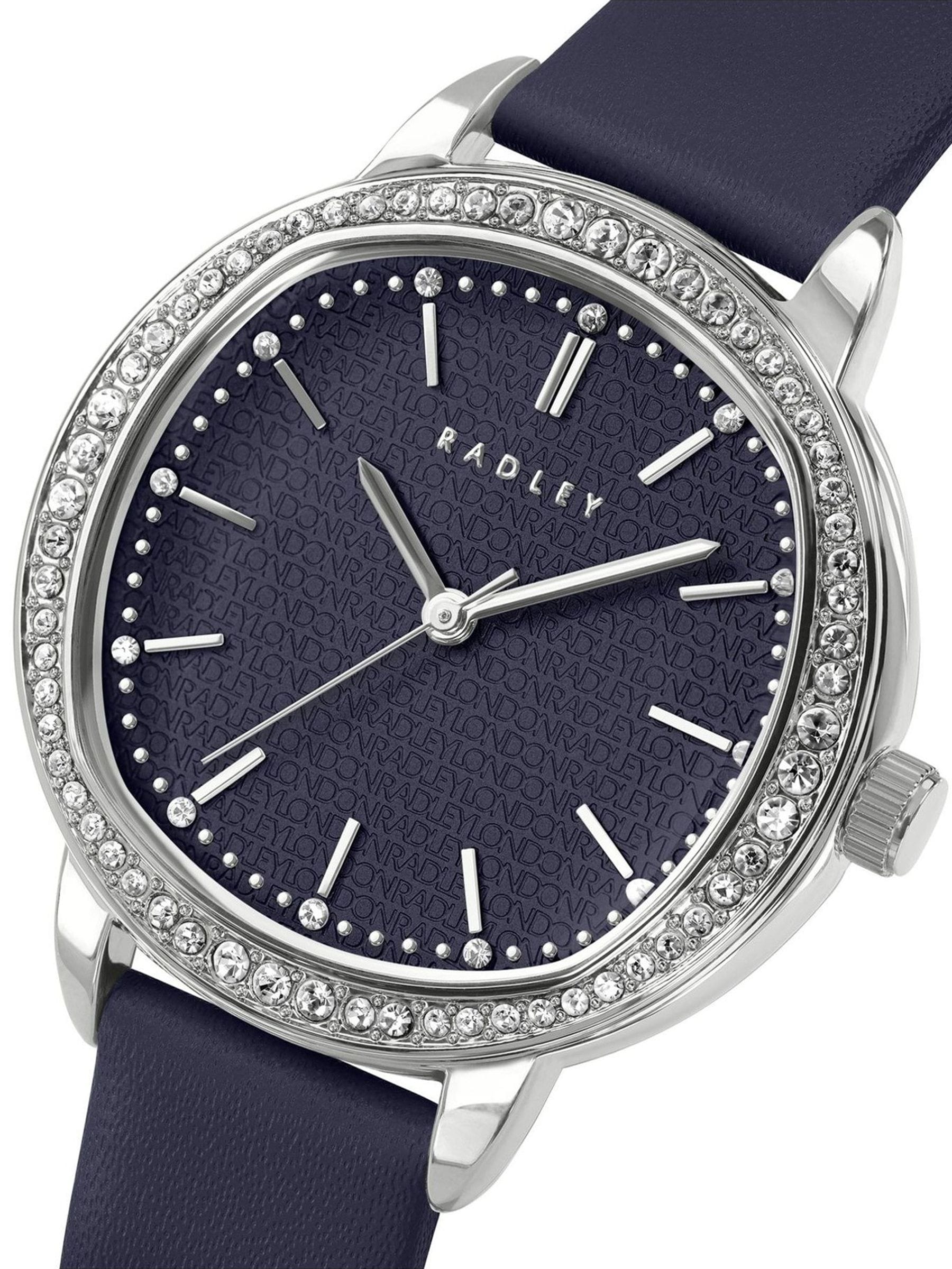 Radley Silver Plated Stone Set Ink Blue Leather Strap Watch. This elegant 36mm watch features a polished silver round case with a clear Czech stone set bezel and a curved mineral lens. The tonal satin dial showcases a deep etch pattern, polished silver detailing, and Czech stone markers. Finished with a slightly tapered soft genuine leather strap, this piece combines modern charm and style. Presented in a beautiful Radley London giftbox, with 2 year guarantee.