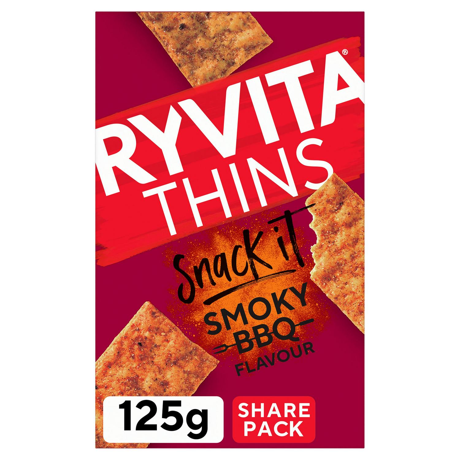 Enjoy the robust flavour of these Ryvita Snack It Thins with a smoky BBQ seasoning. These wheat and rye flatbreads are baked in Britain and provide a satisfying crunch for snacking occasions. Each thin is intentionally portioned, keeping track of your intake simple throughout the day.