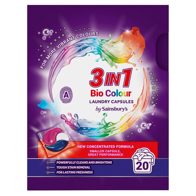 These Sainsbury's 3in1 Colour Bio laundry capsules provide powerful cleaning for everyday laundry needs. They are designed to care for your garments while offering outstanding cleaning performance. The formulation helps maintain bright colours over time.