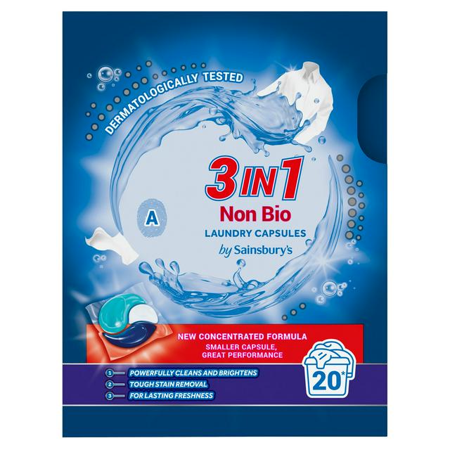 Sainsbury's 3in1 Non Bio liquid laundry capsules offer powerful cleaning and brightening for your everyday laundry needs. These capsules are specifically formulated for tough stain removal, leaving clothes with a lasting freshness after every wash cycle. This careful formulation is also dermatologically tested for increased skin suitability.
