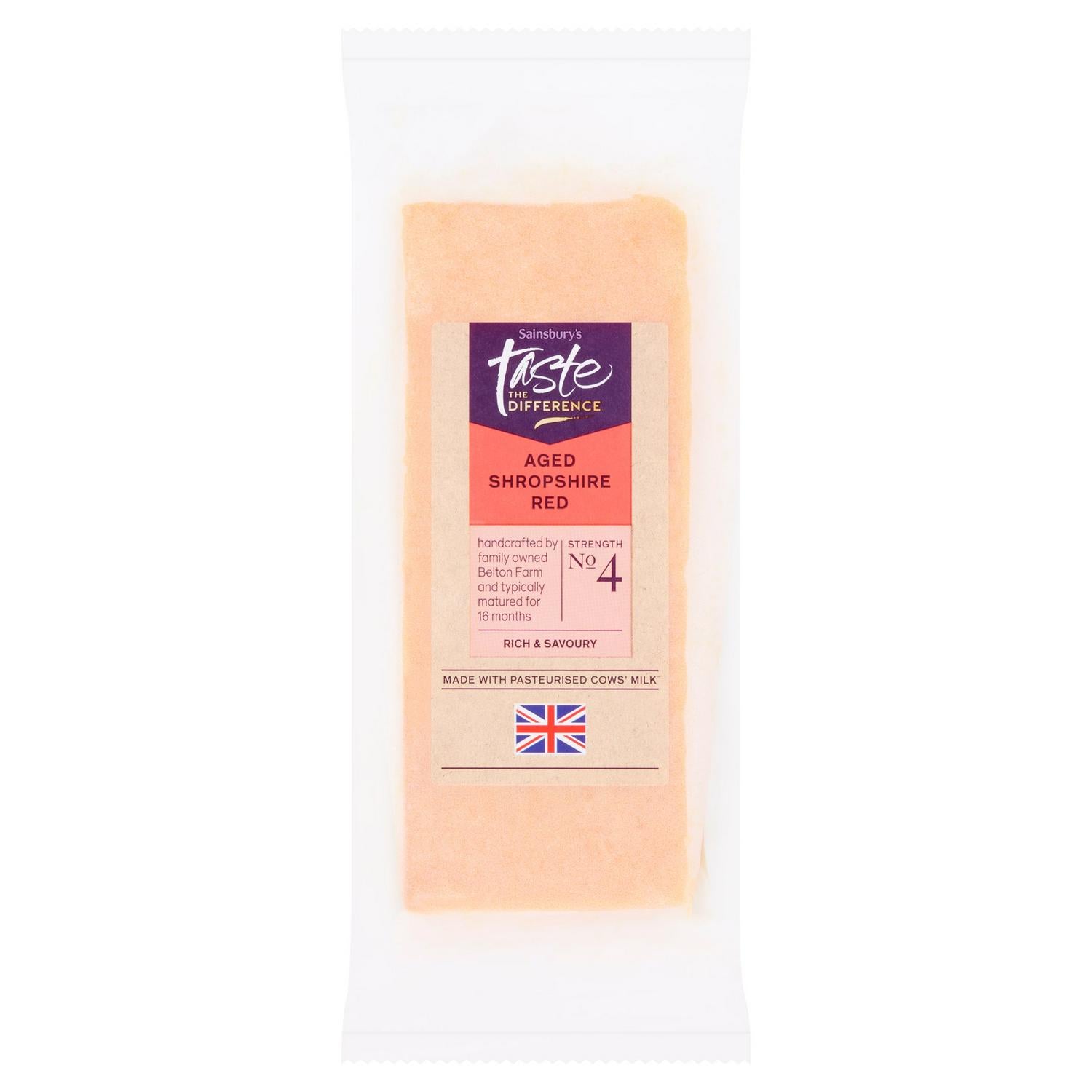 This Taste the Difference Shropshire Red cheese delivers a distinctively rich and savoury profile. Handcrafted by the family-owned Belton Farm, it offers quality derived from traditional methods. This selection is made using pasteurised cow's milk and is perfect for discerning cheese lovers.