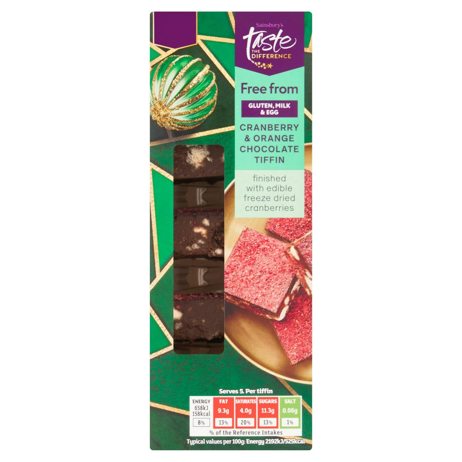 Read More5 Milk, egg and gluten free tiffin with sweetened dried cranberries and sultanas, topped with Belgian dark chocolate, flavoured with orange oil