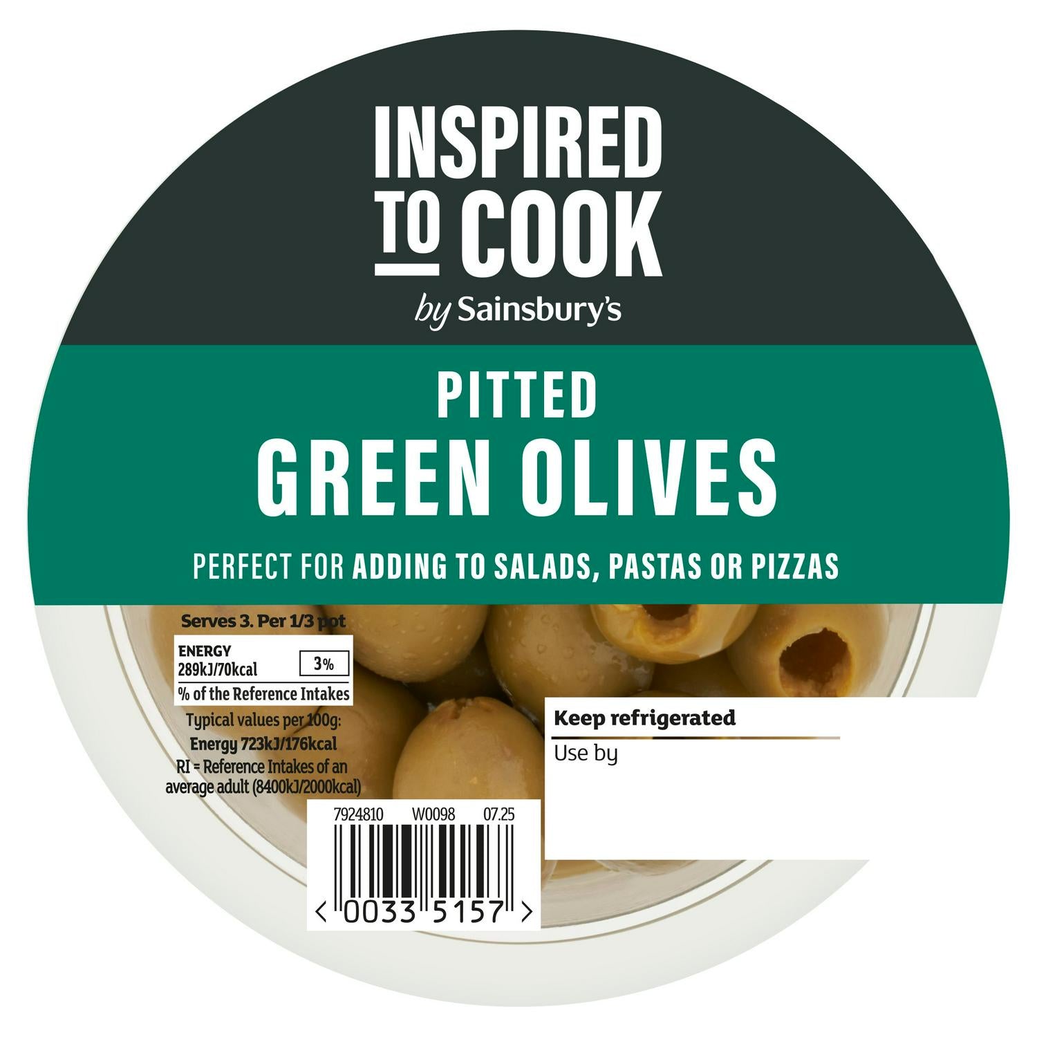These Sainsbury's Inspired to Cook Pitted Green Olives are preserved in rapeseed oil, providing a convenient and flavourful component for your cooking. They are ready to use straight from the pack, offering simple enhancement to various everyday recipes. This product provides an effortless culinary addition, ideal for meal preparation or light snacking.