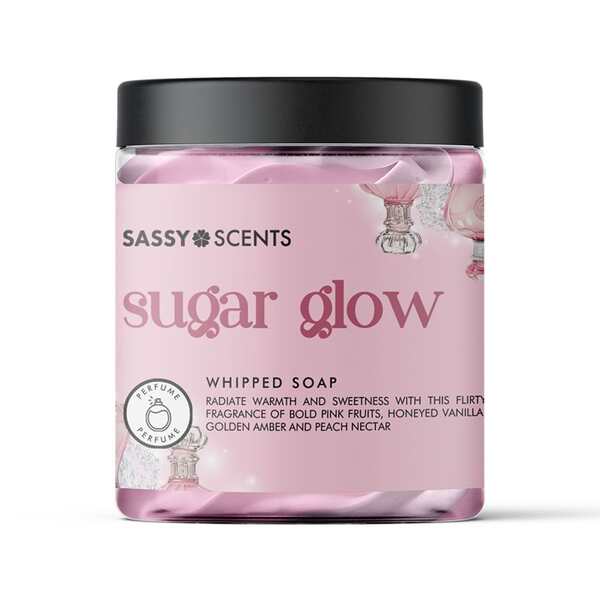 Experience a warm and sweet sensation with this Sugar Glow product. This unique air whipped soap offers a delightful experience for cleansing or shaving routines. Its formula is enriched with moisturizing ingredients like Glycerin, Cocoa Seed Butter, and Rice Bran Oil.