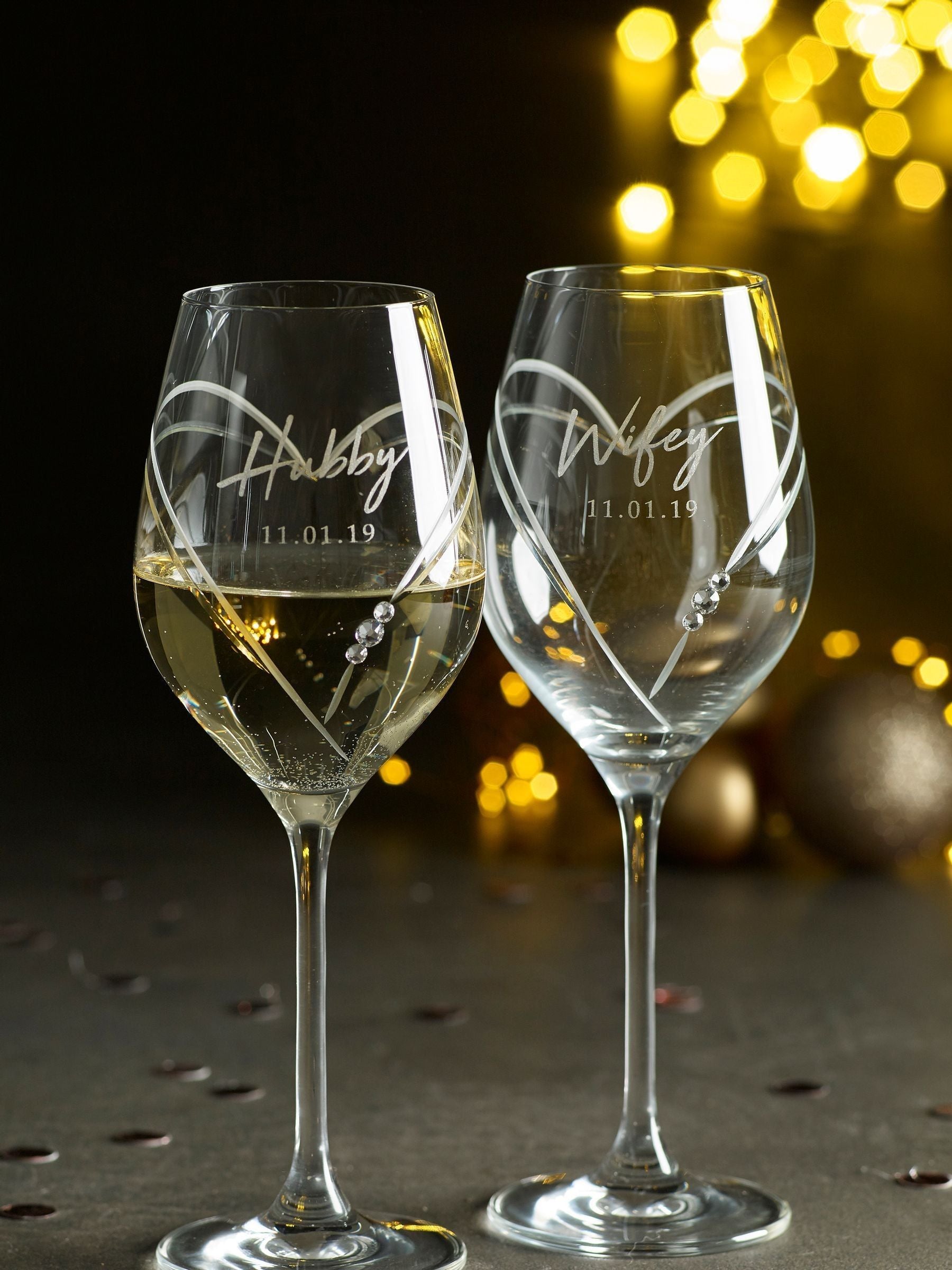 Personalised pair of our diamante wine glasses. Both wine glasses are decorated with heart-shaped cuts and have 3 Swarovski crystals bonded to the glass. It would look great as part of the tableware at any special occasion or presented as a wedding or engagement gift.