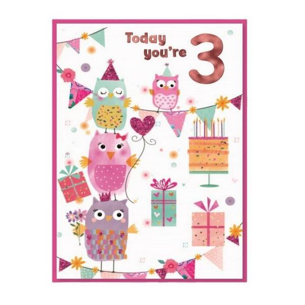 material card design birthday cake number owl present printed text contents 6 envelopes occasion 3rd birthday