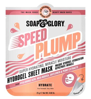 This Soap & Glory Speed Plump mask is a 25g hydrogel sheet mask designed for intense moisture delivery. It targets normal to dry skin types needing significant hydration refreshment. The innovative hydrogel base ensures potent ingredients adhere effectively to the skin surface for maximum benefit absorption.