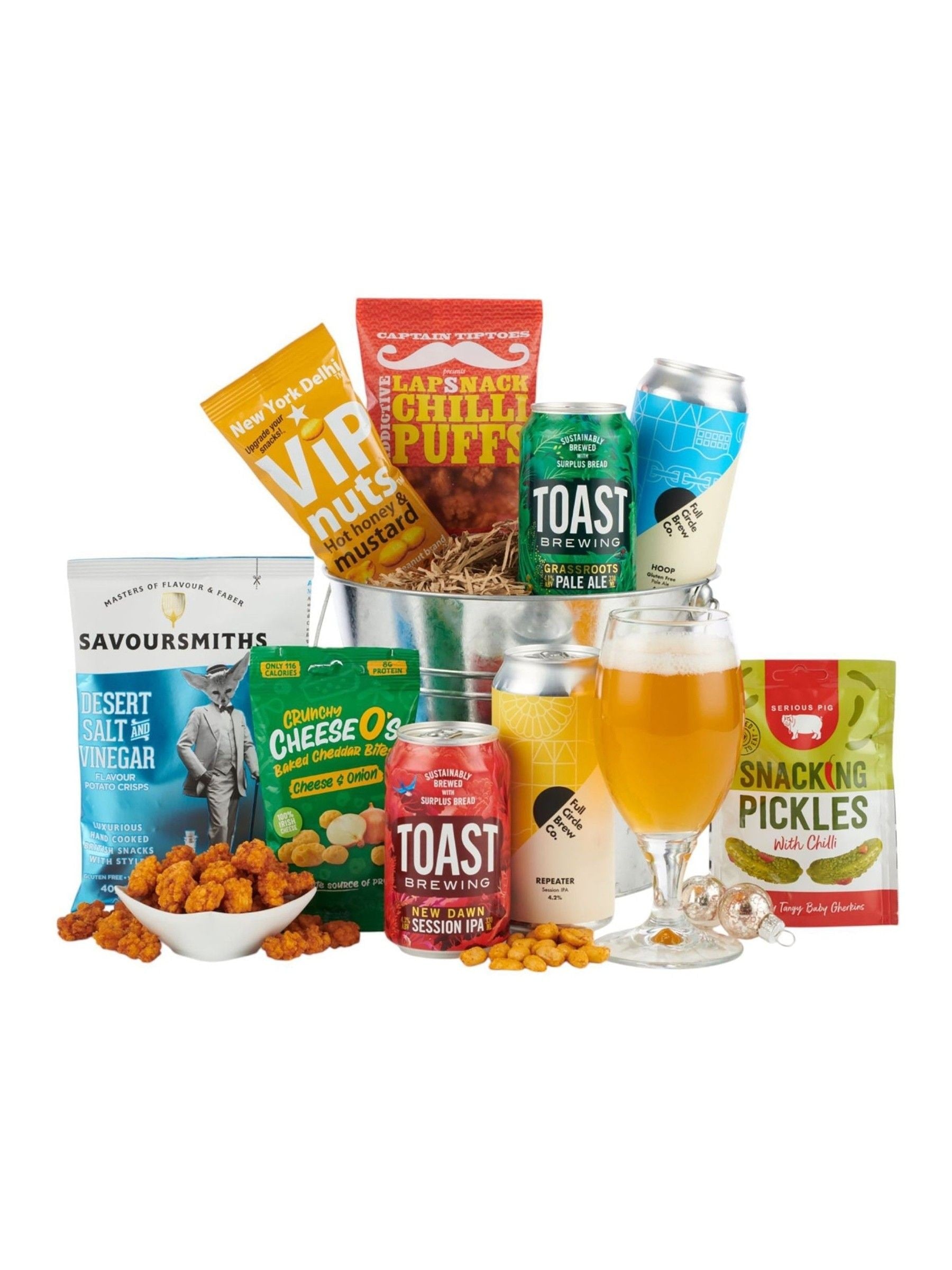 Full circle brewery hoop APA 440ml. Full circle brewery repeater SIPA 440ml. Toast grassroots pale ale 330ml. Toast new dawn session IPA 330ml. Savoursmith desert salt & vinegar 40g. VIP nuts hot honey & mustard 63g. Cheese Os baked cheddar bites cheese & onion 20g. Serious pig snacking pickles with chilli 40g. Captain tiptoes lapsnack chilli puffs 60g. Packed in galvanised bucket.