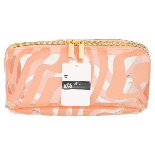 This Superdrug cosmetic case is designed to securely house your beauty essentials during everyday use or when travelling. The peach-coloured bag is constructed from durable PVC material, offering an easy-to-clean exterior. Its expandable nature allows for flexible capacity when packing toiletries and makeup items.