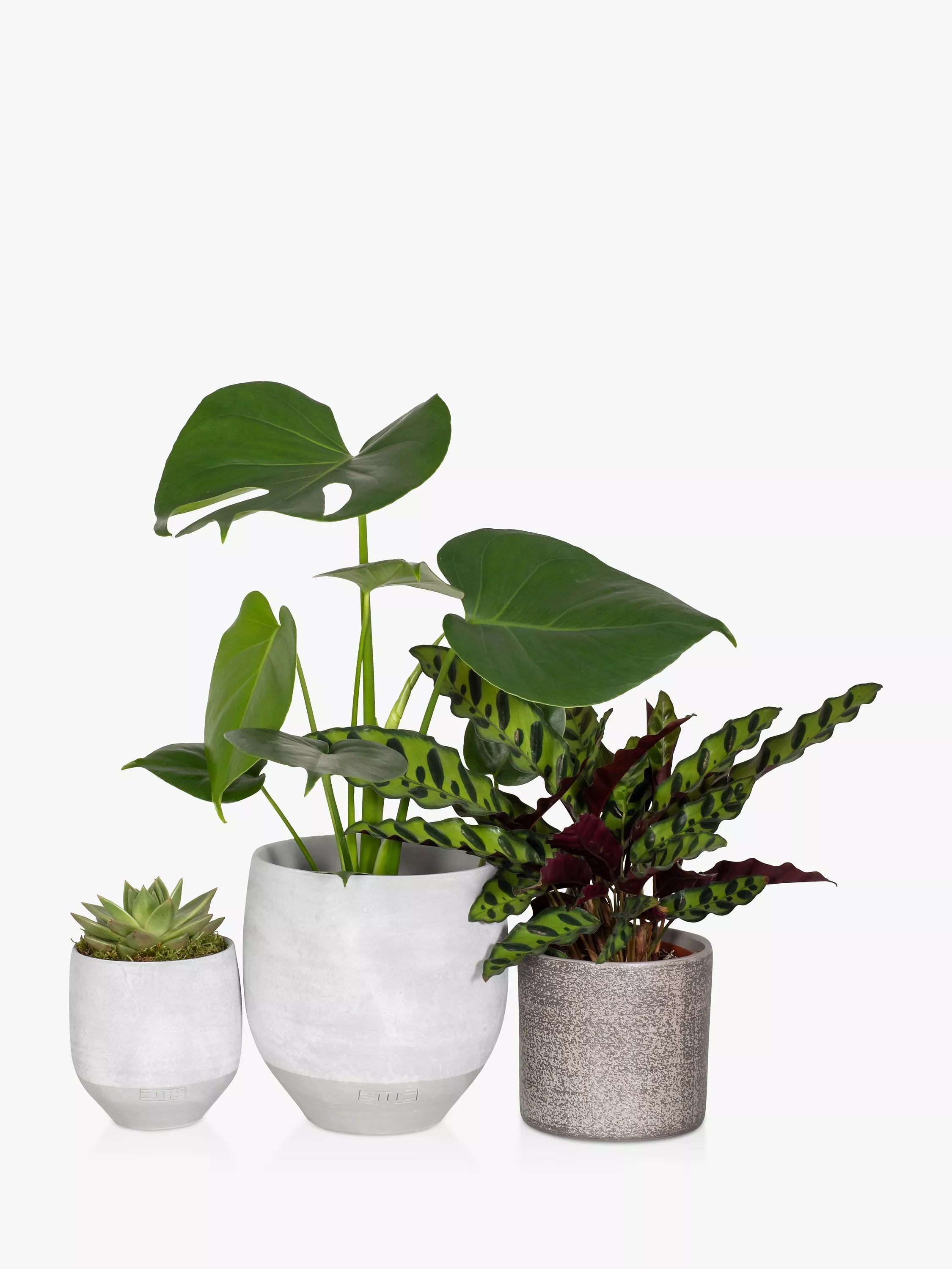 These bold, leafy plants & on trend succulents, in our classic grey ceramics, are selected to be easy to care for & will transform any space. Included in this plant gang is a Monstera, a Calathea and a Medium Miranda. Both the Monstera and Calathea green plants need watering once a week and the Miranda should be watered every 3-4 weeks. Note, don’t forget to occasionally dust the leaves of your green plants to let them absorb light. On the Miranda a few leaves closest to the soil may shrivel up and should be trimmed off to allow the plants to concentrate on new growth.