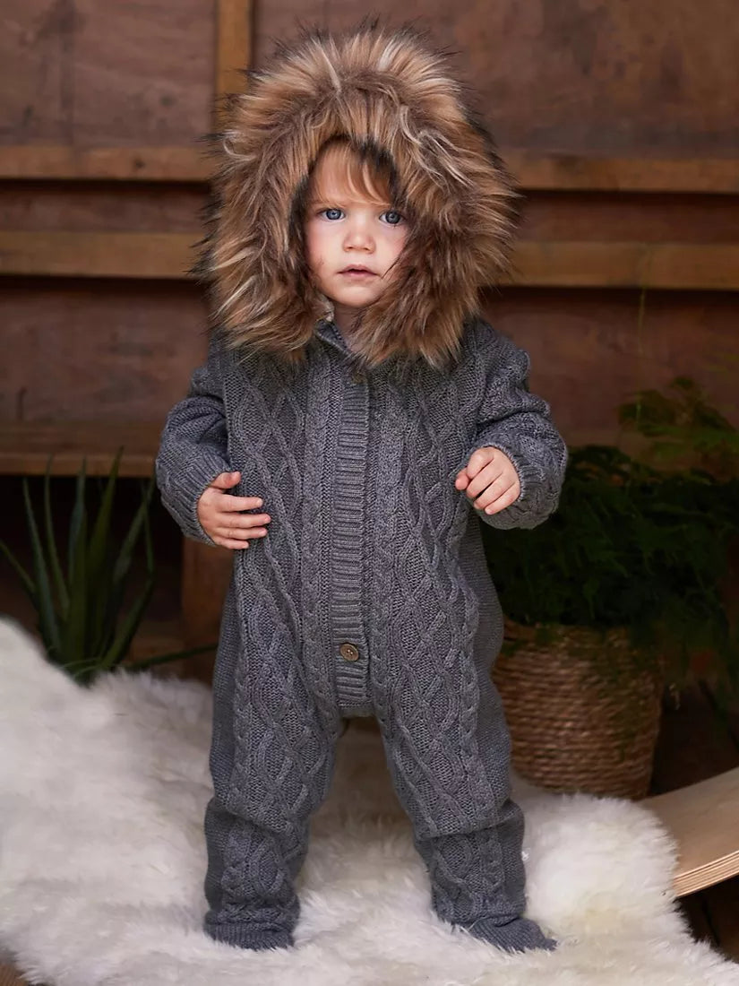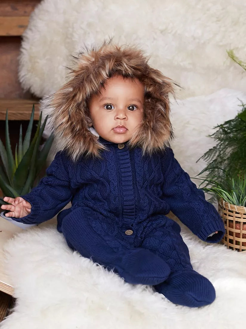 A beautiful knitted snowsuit with fully detachable faux fur trim hood with a soft plush lining. Machine washable, it is designed with a cable knit design outer in 100% cotton, fully detachable faux fur trim and plush lining to hood and a cottons jersey lining to the body.