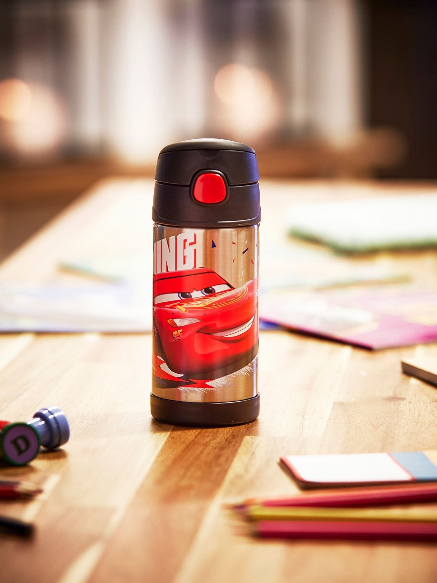 Zoom into an exciting world with our FUNtainer® Bottle inspired by Disney and Pixar Cars. The Thermos FUNtainer® Bottle is made with vacuum insulated stainless steel to keep drinks cold for up to 12 hours. With double wall stainless steel construction that’s built to handle drops, dings and assorted roughhousing. Includes an integrated carry handle, making it easy for kids to carry with them throughout the day. Customize your bottle with adhesive name labels that can be firmly adhered to any FUNtainer product. Two peel and stick labels are included inside this bottle, just write, peel and stick!
