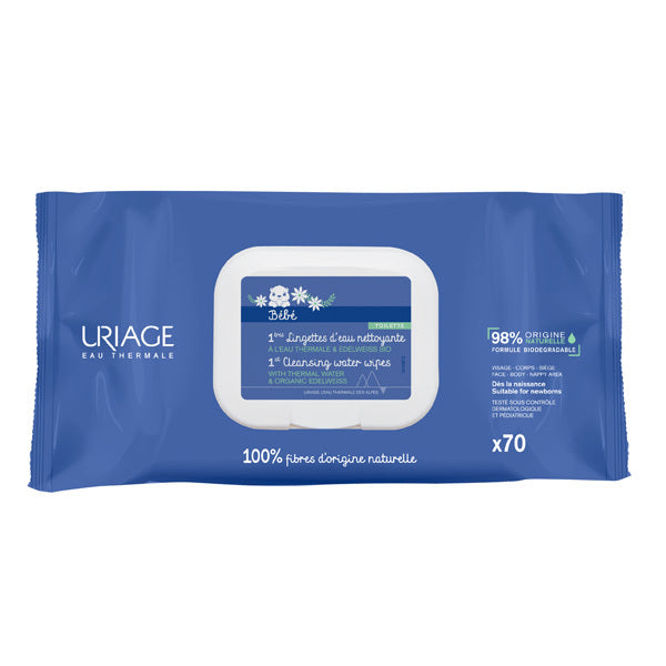 its formula including the natural complex uriage thermal water organic edelweiss gently cleanses and removes dirt from delicate skin enriched with hydrating and softening agents they leave skin clean soft and pleasantly scented ideal for a quick efficient wipe down and guaranteed high tolerance we love their iconic cuddly scent and the wipes made from 100 natural origin fibres 1 cleanse with their ultragentle cleansing base soapfree and physiological ph they gently remove impurities no rinse 2 soothe soften protect thanks to a new complex uriage thermal water organic edelweiss combined with glycerin the 1st cleansing water wipes soothe soften and protect babys delicate skin ecofriendly approach natural origin formula 98 natural origin ingredients locally sourced complex the alps 100 natural uriage thermal water organic edelweiss ecodesigned packaging 100 natural origin and biodegradable fibres