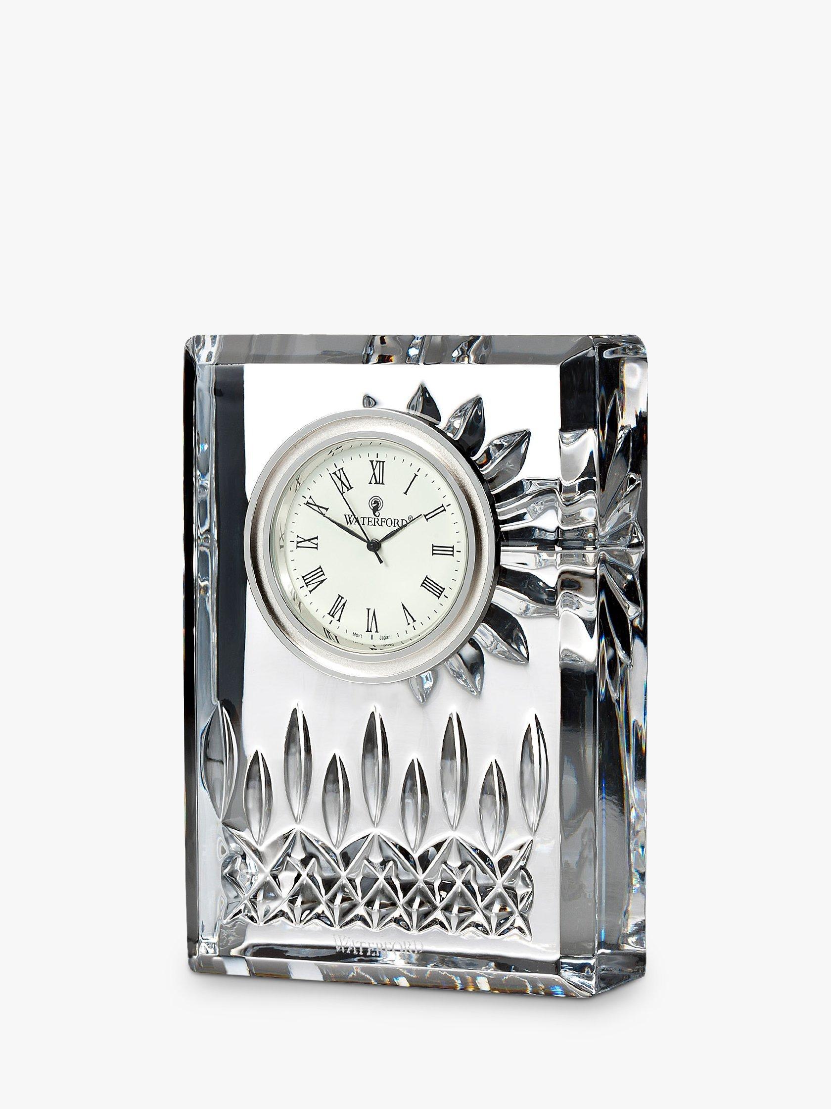 Waterford Crystal presents the Lismore Mantel Clock, a small timepiece showcasing renowned craftsmanship. It features intricate diamond and wedge cuts characteristic of the Lismore pattern. This elegant clock adds timeless sophistication to any setting, offering reliable, beautiful timekeeping functionality for your home space.