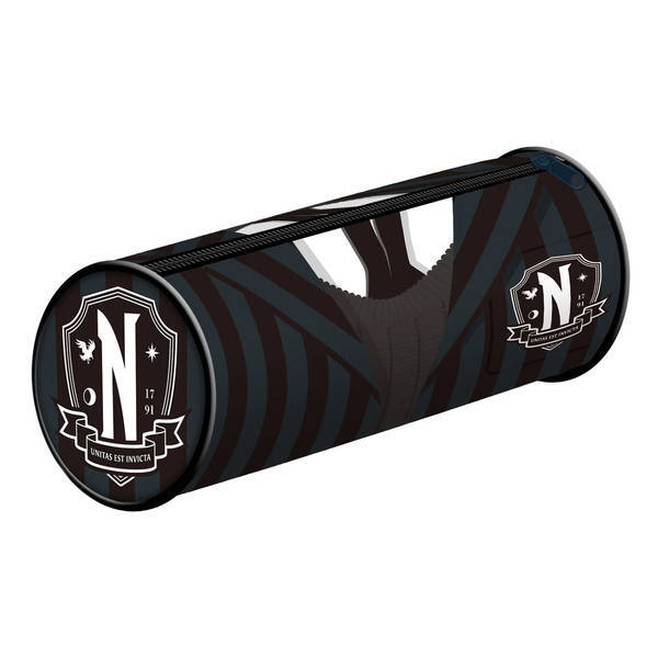 This officially licensed Wednesday pencil case features the iconic Nevermore Academy crest design. Its barrel shape offers a distinct look suitable for organising stationery essentials. Keep your pens and supplies secure with the reliable zip fastening system. This item is 100% officially licensed merchandise from the Wednesday collection.