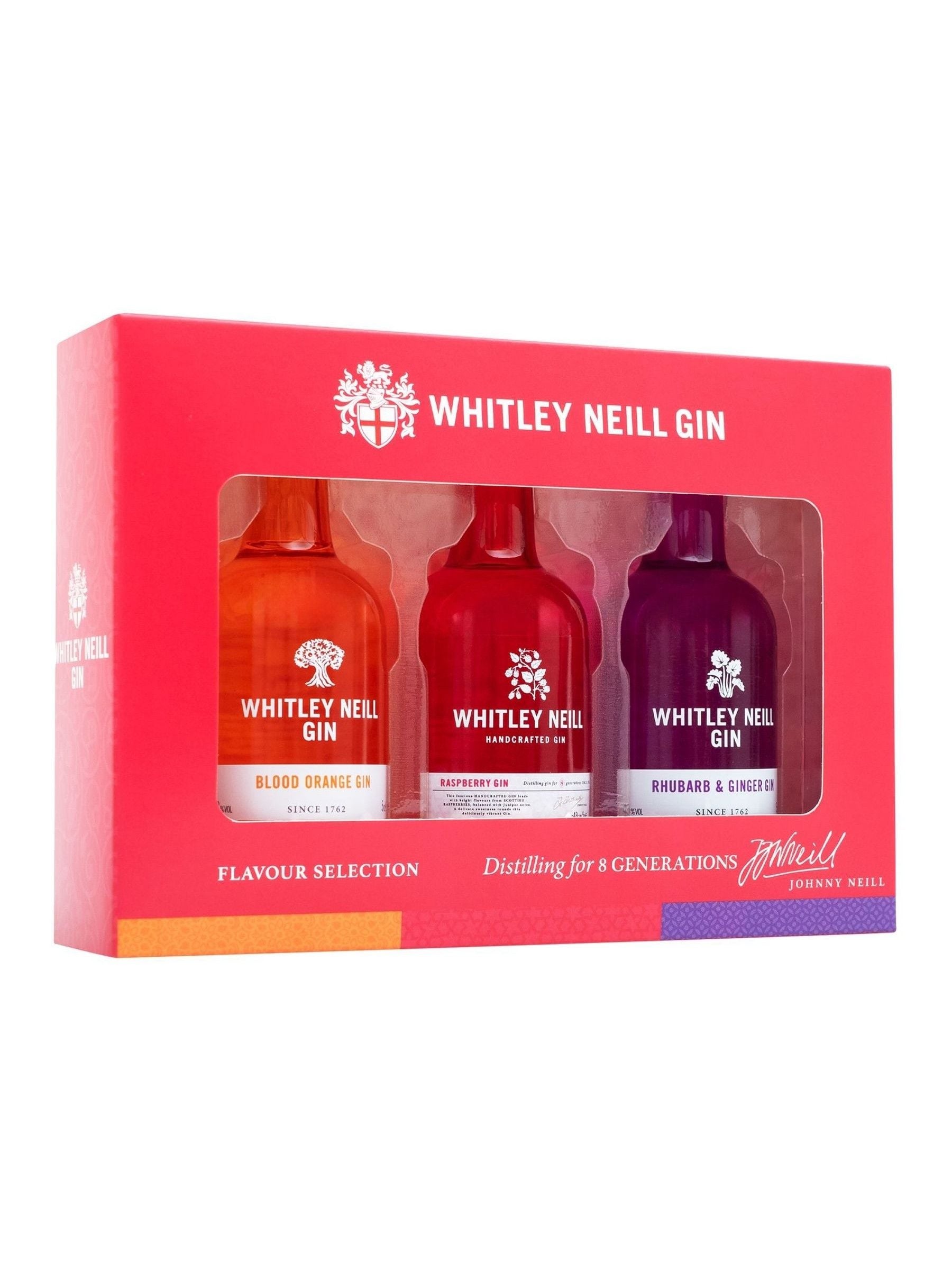 Premium alcohol gift set: 5cl alcohol miniatures; 1x Whitley Neil Blood Orange 5cl 43% ABV, 1x Whitley Neill Raspberry Gin 43% Abv, 1x Whitley Neill Rhubarb and Ginger Gin 43% ABV, In a well presented gift box,