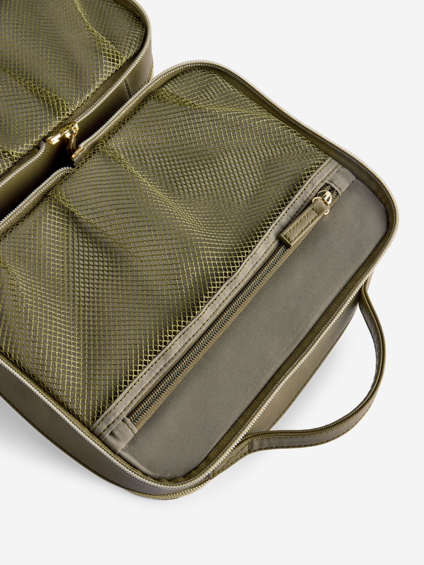 Keep your beauty essentials on-trend and organized with our new olive green makeup bag. The sleek faux leather finish is a perfect style statement, while the transparent outer layer lets you see all your products at a glance—no more rummaging! This versatile bag is perfect for travel. It zips apart into two separate bags for ultimate flexibility, or you can keep it as one large bag to keep all your products neatly together in your luggage.